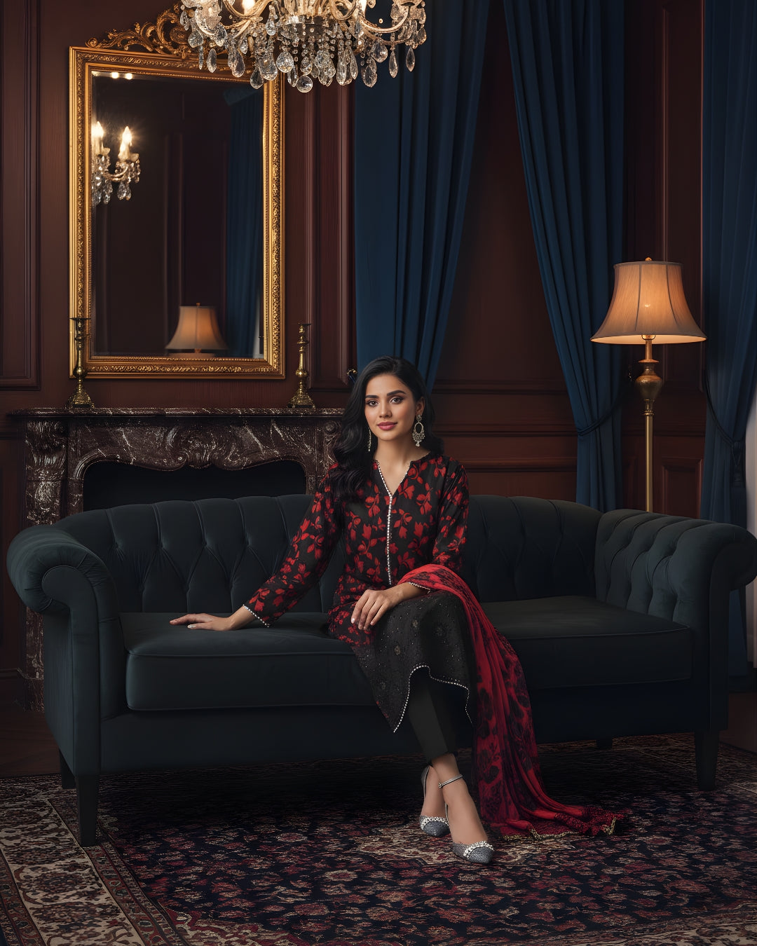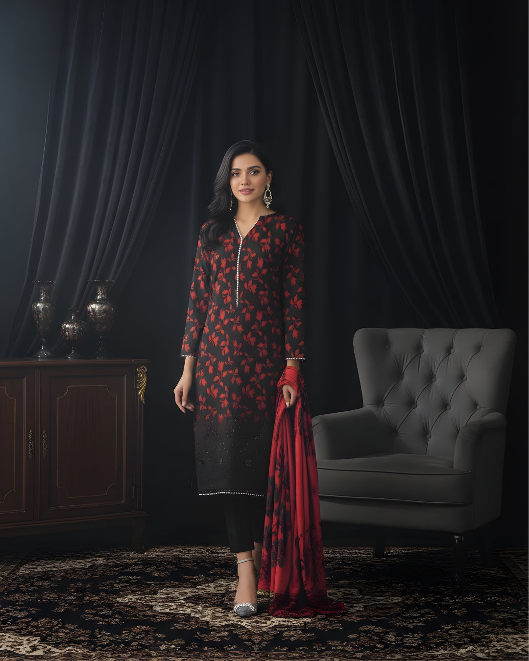 The shirt's intense color scheme is perfectly mirrored by the Digital Printed Digital Linen Dupatta, which features a rich scarlet base with elegant black and rust ornamental designs. This high-contrast combination creates a sophisticated and modern aesthetic. Crafted from comfortable, high-quality Digital Linen, this suit provides excellent warmth and drape. Complete with a comfortable Dyed Trouser in matching black, this ensemble is an ideal choice for stylish evening wear and celebratory occasions.