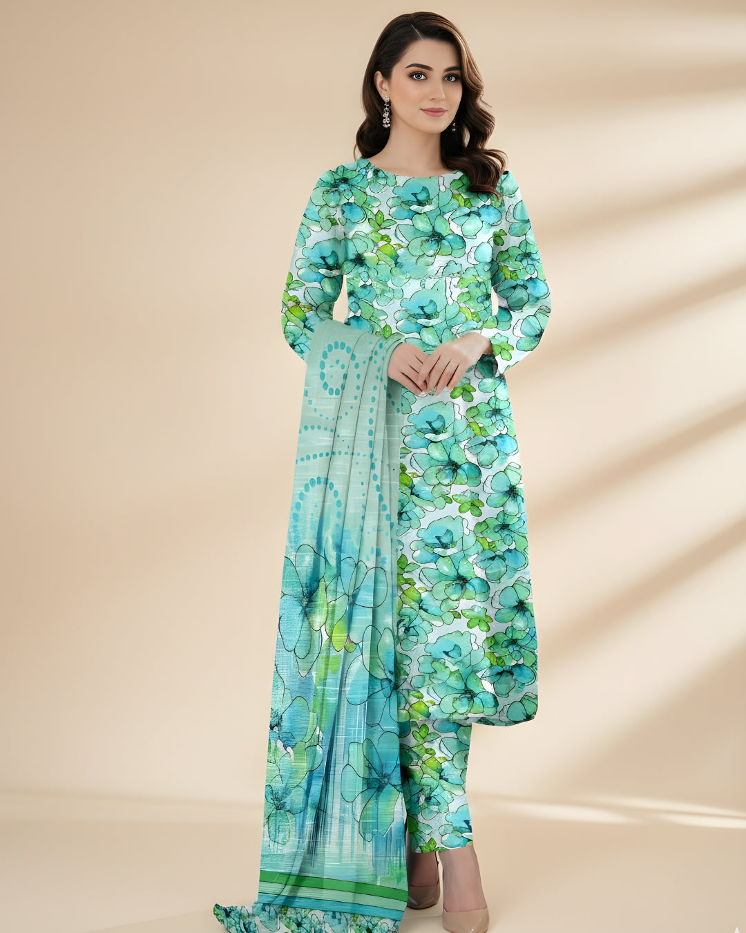 The high-impact all-over print ensures you stand out. The digitally printed Khaddar dupatta elevates the design further with large, expressive blue motifs and a bold black geometric patterned border. This piece is the epitome of contemporary winter fashion, designed to keep you warm while delivering maximum style impact.